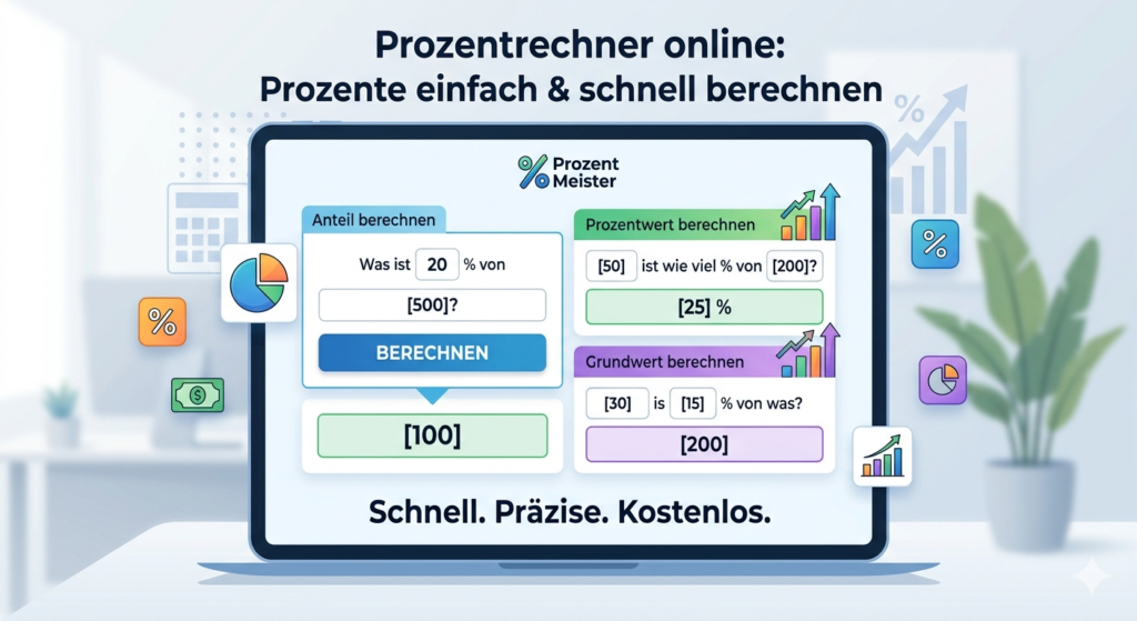 Prozentrechnung begegnet dir täglich – beim Einkaufen, im Job und beim Sparen. Mit den drei Grundformeln (Prozentwert, Prozentsatz, Grundwert) löst du jede Aufgabe. Und wenn du keine Zeit für Formeln hast: Unser Prozentrechner online gibt dir das Ergebnis sofort, kostenlos und mit vollständigem Rechenweg.